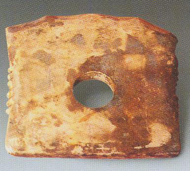 鉴赏要点 二里头文化遗物。玉钺体呈扁平状,上方而下略呈弧形,两侧有齿共六对,中有一穿孔,全器朴素无纹饰。