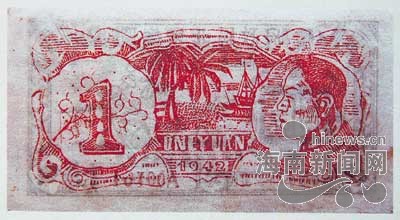 1942年发行的壹元面值“琼崖东北区政府”代用券,背面为海南黎族耕耘图。