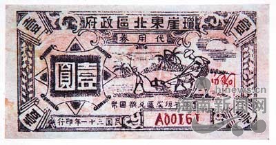 1941年11月,中共琼崖特委领导的琼崖东北区抗日民主政府成立。为稳定金融市场,反击日本侵略军的经济封锁,1942年初,民主政府发行了1元面额代用券。券面印有“琼崖东北区政府代用券”和“凭券在琼崖区兑换国币”等字样,还印有海南椰林风光和船舶等图案。1942年下半年,由于日本侵略者实行“三光”政策,社会经济受到严重破坏,代用券的印刷工作无法继续,被迫停止发行。