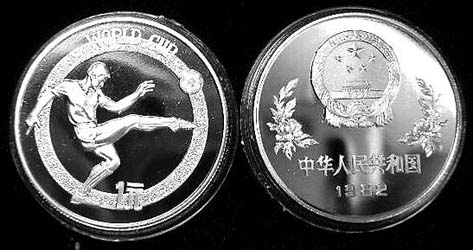 中国人民银行在1982年发行了一套与金银纪念币图案完全相同的铜质币,这就是著名的“第12届世界杯足球赛”纪念币。当年,我国著名足球运动员容志行、迟尚斌、古广明和沈祥福等曾参加了第12届世界杯足球赛“亚大”赛区预选赛,可惜未能出线。这套“世界杯”铜质币正是为纪念这项赛事而发行的。该币在设计和制造工艺上,采用了先进的镜面折光雕刻技术,雕功细腻,线条明快,制作精美,立体感强,产生出多层次的视觉效果,其制作质量几乎可与金银纪念币相媲美,该币图案是十分精彩的射门镜头,具有很高的观赏性。该币单枚成套,面值为壹元,发行量极为稀少,仅为4.016万枚。