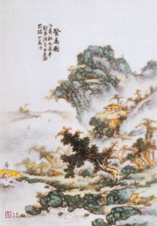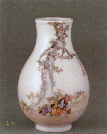 何许人专事雪景山水,在中国陶瓷美术史上,是首开先河之举。他的雪景色彩淡雅,清晰中见厚重,这是粉彩雪景的独到之处。何许人雪景中树的造型颇为生动,如雪景瓷板画《孤山放鹤》(图19)极具功力,树的起承开合、前后层次、曲折走向十分生动自然,且意境沉静、苍茫、空灵,这正是文人画要旨之所在。如果说何许人雪景画有何不足,则是远景虚实处理稍有欠缺,缺乏丰富的层次感,故而影响画面之意境。