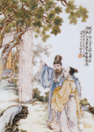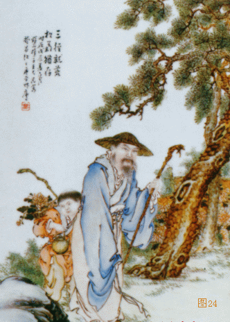 “珠山八友”中,王大凡所经历的时代跨度较大。瓷艺作品的内容也更多样、广泛。作品在艺术表现上,也体现了不同时期的艺术特征。比如他20世纪20—30年代前期的瓷艺作品,受文人画影响较深,艺术表现上追求雅逸之气,题材多以文人雅士居多,强调逸笔草草的写意性。如瓷板画《苏东坡“玩月承天寺”》《陶渊明“三径就荒,松菊犹存”》(图24)十分典型。20世纪30—40年代,儒家思想的经典题材不少,民俗、民间意趣的题材也常画。王大凡这一时期的瓷艺作品有三大特点:(1)针对市场需求在题材的选择和画法上,作了一定的妥协,瓷艺作品色彩艳丽。(2)器皿装饰增多,以精美图案相辅的作品增多。应该说这种“增多”是一种进步。虽然其图案是由他人所绘,不能构成个人作品的完整性,但却增加了作品的审美价值——只要图案不喧宾夺主,还是能起到良好的衬托作用。(3)也许受某些西洋画意识的影响,无论是人物还是山石、树木的体积感,或是与人物相辅的桌、椅、门,窗等道具的体量感,通过细彩均得到加强,体现了物体结构之严谨,雅俗共赏的特征颇为明显。20世纪50年代后期,王大凡在轻工部陶研所工作,由于工作稳定,因而其瓷艺作品的文人画意识又有所抬头,至少表现在瓷艺的设色上,已没有20世纪30—40年代的艳丽了。王大凡还具有驾驭大场面瓷绘的能力,如瓷瓶《竹林七贤》的人物、配景均得以全面展开。不过其人物画由于过分追求形象的体积感,故在艺术表现上显得有点别扭,致使一些瓷艺作品凝重有余,空灵不足。