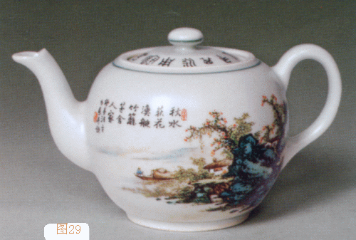 在保持并加强陶瓷装饰的审美特征方面,“珠山八友”其他成员也各具特色。汪野亭本来学清“四王”的山水,王石谷对他影响最大。考虑到陶瓷装饰的需要,他撷取了元代倪云林绘画中的适合陶瓷装饰的平远构图法,并结合“四王”的画法自成面貌。图29瓷壶腹部右方的山水画,采用平远构图法勾勒,十分得体;左上方落款“秋水、荻花,渔艇、竹篱、茅舍、人家”的元曲句,意境十分优美,并增加了构图的平稳与渺远之感。尤其是壶盖以篆书装饰,颇见古雅,而壶与盖顶两道线条,加强了装饰效果。这把壶既是件装饰效果颇佳的高档工艺品,又是件装饰与瓷画并举的优秀瓷艺作品。