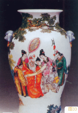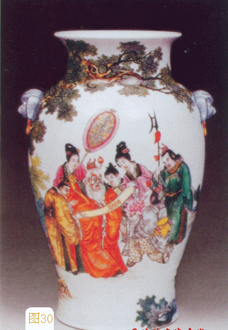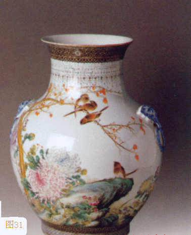 王大凡的双狮挂环瓶(图30),亦是装饰与瓷画结合的精品。双狮用紫色点彩,十分雅致,而挂环彩油红,又见明快,颇具装饰性。瓷瓶画《郭子仪“富贵寿考图”》,为通景装饰画,瓶上人物与树石环绕整只瓶的构图,主体人物与环境的安排主次分明,空白的处理大小有别,人物色彩与玲珑双耳浑然一体。这种通景画,不但要首尾衔接得体,又要具装饰意味,如果没有相当的装饰修养,是达不到此种效果的。程意亭的《鸣鸟知秋临》(图31)双耳瓶也颇具匠心,瓶口与瓶脚用深蓝色画图案,双耳用蓝色点彩,瓶身所画的锦鸡菊花工整细致,画面的轻与重、虚与实相得益彰。此外在徐仲南、何许人、田鹤仙、邓碧珊、毕伯涛等人的器皿类作品中,以画代装饰,或画与图案相结合的装饰,均能达到较好的装饰效果。由于他们长期游弋于陶瓷艺术的海洋中,对于画与装饰在陶瓷艺术中如何交织运用,均有相当的经验和把握能力,他们的瓷艺作品,大多具有文人画与陶瓷装饰并重的双重审美特征。