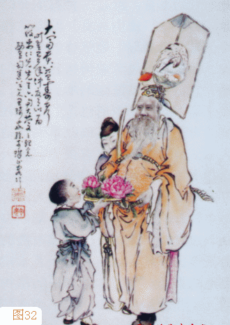 (1)在瓷艺创作中,着意追求文人画的意境美,并把这种绘画形式的审美标准,放在极重要的地位,使陶瓷艺术上升到纯艺术的高度。所谓意境,“就是心与物、情与景的统一,就是艺术家主观思想情感、审美情趣与自然景物的贯通交融”(注17)。而“珠山八友”的瓷艺作品,正体现了中国绘画中关于主客体的统一,天人合一的审美境界。从美学上讲,“意境”说未必能概括主客观交融的全部审美内涵,也许“意境”、“意象”、“意趣”三意并立的主、客观交融的审美结构更合时宜。所谓境者,景物;象者,氛围;趣者,情调。故山水画言意境,人物画言意象,花鸟画言意趣。“珠山八友”中,王琦(图32)与王大凡(图33)画《富贵寿考》,都是“以我之情”塑造人物,表现“富贵寿考”的氛围。两人的作品,却因有不同的“我”,也就具有不同的形象特征和场景氛围,体现了不同的心境和审美意象。王琦画郭子仪,重在形象的内在精神气质——表现功勋卓著且又富贵长寿的轩昂之气;王大凡画郭子仪,则着意于前呼后拥的荣华富贵。这种不同,颇能看出两人不同的内心世界。