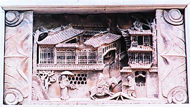 该“石窗”所用石材,选用浙江地区特有的青石精雕而成。“石窗”长69厘米,宽38厘米,它的左右两旁边缘,采用中国画装帧手法,以浅浮雕饰传统的荷花叶茎,寥寥几笔,顿使荷叶鲜活起来。荷花是我国传统题材,一般文人雅士总自喻为荷花,有“出淤泥而不染”高雅之意。“石窗”的上下边沿,则以明线条凿出对称的二根线饰,一气呵成,毫不滞涩,显得简朴、明朗。作为背景图案,石雕艺人又充分运用线刻、浮雕、浅浮雕、镂空雕等多种手法,互为交替,灵活多变,如古建筑中的楼宇台阁,飞檐翘角,窗棂门户,古树老枝等等,起着巧妙的环境烘托作用,寓意深邃,耐人寻味,且雕刻得极具立体感。尤其是那画面上的人物,造型生动,刀法之娴熟,工艺之精湛,构图之简练,将古代江南市井生活,表现得淋漓尽致,令人叫绝。