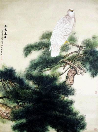 田世光一直居住在颐和园西山东边远离闹市的柳浪庄,故时钤“柳浪村人”印。这里有香山红叶,有他喜欢的虫鸟。他笔下的青松白鹰、柳岸河塘、雀鸟蜂蝶,都得自生活又寓情于物,或与山水结合、或参用小写笔法,具灵便松活、色彩典雅之特色。这些特色在为纪念国庆30周年而作的《英姿万古》中亦可看到。