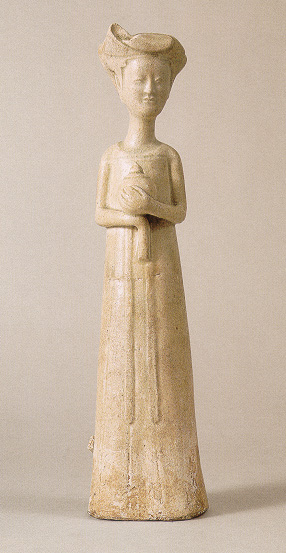 俑高26.5厘米,为典型隋代侍女形象,发髻高耸,脸型瘦削。形体修长,面带微笑,右手前弯,左手捧一小罐。器物通体施白釉,釉色微闪青。隋代陶俑在传世品中所见相对较少,女侍俑更是不多见。