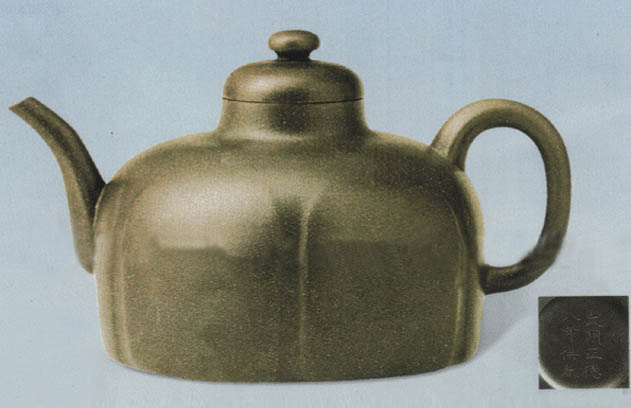 此壶原是仿景德镇的永乐窑竹节把壶,壶身分六浅瓣,配以壶盖,壶嘴及壶把皆起筋纹,以应壶身的瓣纹。壶身分上下两节塑造而在壶肩相接。壶以黝黑紫砂制作,更掺以金砂闪点。铭文笔法富晋唐贴意。