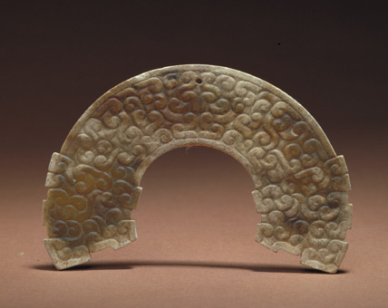 玉龙纹璜,春秋晚期,长9.3cm,璜面最宽6.3cm,厚0.3cm。