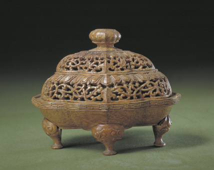 竹雕海棠式镂空香盒,清中期,通高8.2cm,最大口径10.2cm。