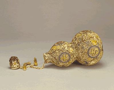 圆雕葫芦式,以镂雕及染色等技法制成。外壁满镂钱纹锦地,并浮雕染色缠枝瓜果、花蝶、蝙蝠纹饰。正中两面开光,一面镂雕楷书填金“大”、“吉”二字,一面镂雕填红隶书双喜字。盖钮内有螺旋套口,腹内有活环长链一根,链上下与葫芦盖底相连。长链上又有三条小链,每条小链上分别带有一只小葫芦,雕刻极为精细。