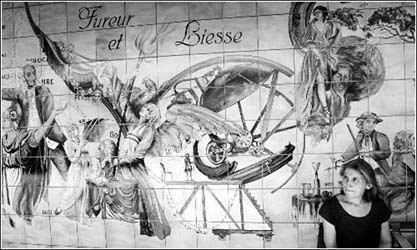 | 两名年轻人从巴黎的阿贝斯地铁站一个换乘通道的壁画前经过。1970年,该站被列入国家一级古迹 |