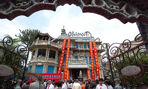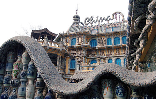 天津收藏家张连志从2002年开始,先后用去4亿多片古瓷片、5000多个古瓷瓶和4000多个古瓷盘碗,对一座法式小楼进行装饰改造,吸引了不少市民和观众的目光。新华社记者王晔彪摄