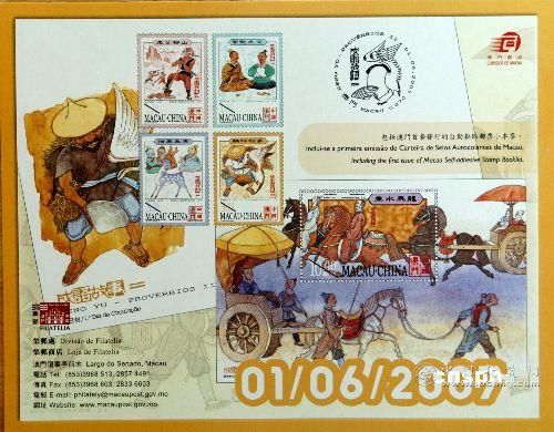 澳门邮政局将六月一日发行《中国成语故事二》邮票一套,四枚邮票面值分别为1.5至3.5澳元。邮票图案由廖文畅先生设计。邮票题材为愚公移山、管鲍之交、指鹿为马和鹬蚌相争。小型张的设计则以车水马龙为题材。