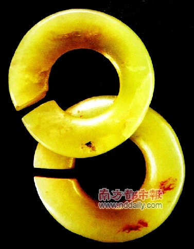 玉玦是我国最古老的玉制装饰品,为环形形状,有一缺口。在古代主要是被用作耳饰和佩饰。此次展出的一对玉玦来自8000多年前,是目前中国发现最早的玉耳饰,为中国玉文化的起源找到了重要源头。