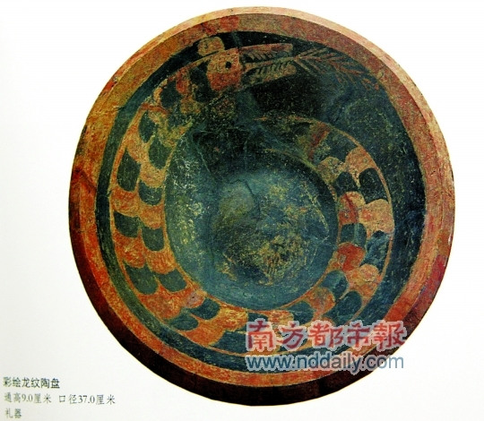 这是一个从山西省陶寺遗址出土的,口径达37厘米的陶盘,盘中绘有一龙。此盘已有约4200多年历史。“这龙看起来像蛇,嘴里还有蛇信子”。考古学家认为这是“王室”使用的礼仪用品,从这个器物可以研究中国龙的起源,研究中国龙文化的现象。“现在人们认为龙是个传说,但从出土的文物中,可以看出龙是真实存在的”。