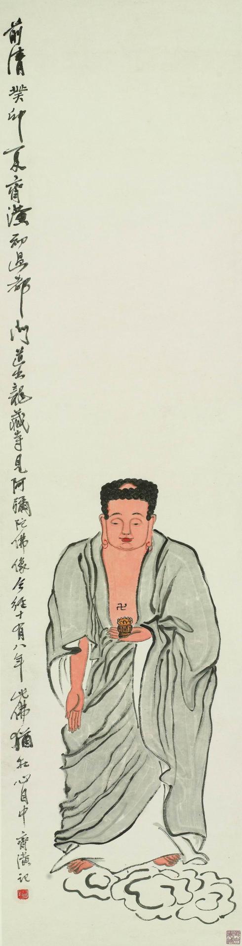 《阿弥陀佛》摹造龙藏寺阿弥陀佛立像。佛祖凌驾于祥云之上,左手托莲台,右手垂下施接引印,生动传神,系白石老人心中之佛的写照。《阿弥陀佛》摹造龙藏寺阿弥陀佛立像。佛祖凌驾于祥云之上,左手托莲台,右手垂下施接引印,生动传神,系白石老人心中之佛的写照。