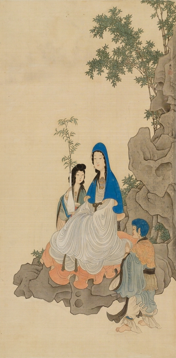 海派代表任熊《观音大士》。任渭长此幅观音工笔重彩绘于绢素之上。观音开像古穆静谧,两侧龙女与善财童子眉目清晰。人物衣物皆以高古游丝描,线条劲挺,转曲自然。背景洞石空勾无皴,以墨渲染浓淡以别向背。旁衬翠竹双勾填彩。虽历一个半世纪,然绢素如新,敷色秾丽,堪称绝品。