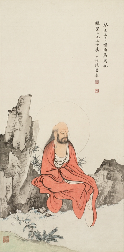 陈少梅精品《无量寿佛》,此画为陈四十年代之作,无量寿佛寓祝寿之意,人物气息古朴清奇,线条刚劲俐落,具浙派笔意,背景岩石以其擅长北宗小斧劈皴法出之,极见用心。