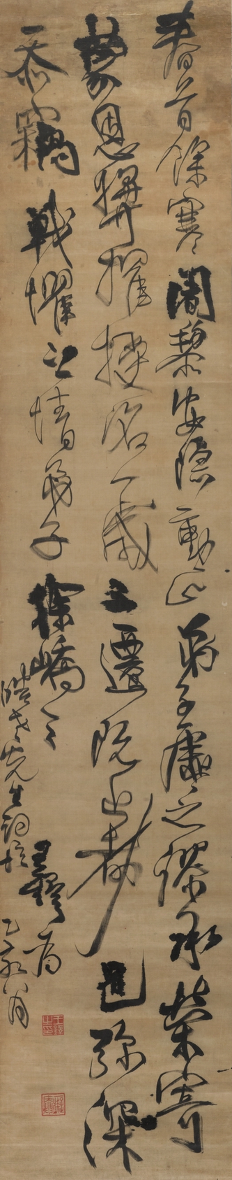 而从其临古书迹来看,绝大部分是《淳化阁帖》中的羲、献诸帖。上及张芝、钟繇,下至南朝诸名家。小楷学钟;大楷学颜、柳;行书学二王外,参颜与梁王筠法,而主要得于米芾。临书大致可以分为两种类型:一是以横卷或册页形式作较忠于原帖的临书;一是以狭长条幅的形式作表现式的临书,由于意在透过古人表现自我,故经常以「背临法」书写,将自己的情感情绪融入其中,对古帖采取再诠释的仿古,而能不受古帖的羁约。这类的临书以长条幅的连绵草最具代表性。此作正是属于后者,运用不同笔的材料、墨色或夸张的字体变形,或某一风格特征的强化,使视觉效果更加强烈。这种临书方式,已完全脱离古帖,只以古帖文字为其内容,实际上仍是自我书风的摸索。