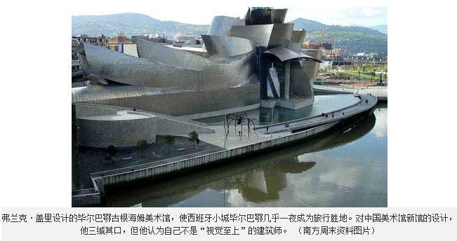 盖里:毕尔巴鄂的古根海姆美术馆就跟悉尼的歌剧院一样,两个城市都很清楚,要通过建筑来赢得城市的重要性。我不知道在北京这样已然非常著名的,也有了很多美丽的标志建筑的城市,是否还需要这样做。