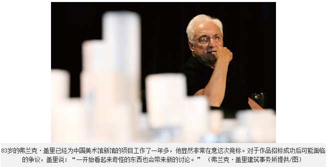 当年参加竞赛的设计方案只用了30天时间,盖里胜过了日本建筑师矶崎新和奥地利建筑师沃尔夫·普利克斯。中国美术馆新馆的这次设计竞赛对他来说不是一般的漫长,83岁的盖里为这个项目已经工作了一年多。他显然非常在意这次竞标。2012年2月,他同美国副总统一起会见了到访的中国国家副主席习近平。3月他再次来到北京,尽管竞标过程不公开,不能透露任何设计方案细节,盖里还是主动邀请中国媒体采访。