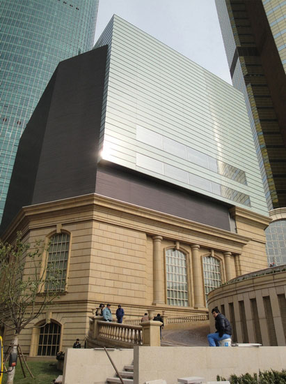 改建完成的震旦博物馆外观是以玻璃幕墙构成的几何体,嵌在原本的古典风格大理石墙面上。到了夜晚,它会成为一个发光体,就像黄浦江畔一个温润如玉的文化宝盒。