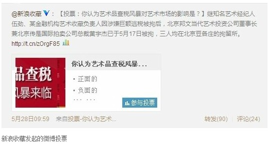 针对风起云涌的艺术品查税事件,新浪收藏频道5月28日发起了微博投票:你认为艺术品查税风暴对艺术市场产生了什么影响?博主耘林章文在微博上就此话题发表了他的三点意见:第一、直接影响几大艺术机构面临退场危险,这些机构经营艺术市场的金额超过10亿元;第二,税收问题一定会严重影响内地与香港及国外艺术品流通,高额的税收让大家重新审视市场风险;第三,税收问题让艺术圈内增加保护意识,让偷税艺术家、机构惶惶不可终日,大家会谨慎介入市场。就此话题,新浪收藏电话采访了耘林艺术品交易中心常务副总经理章文先生,他详细的阐述了他的这三个方面的看法。