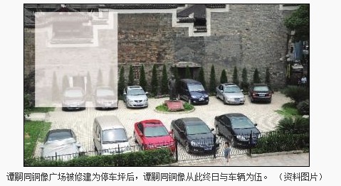 5月30日上午,记者来到浏阳谭嗣同故居。这里的情景依然和三年前一样,故居南侧的停车场里已经停满了车,谭嗣同铜像被小车层层包围。停车坪离故居南侧围墙最近仅1.3米。故居大门旁的说明碑指出,谭嗣同故居的保护范围为四周30米,停车坪显然位于其中。据故居工作人员介绍,每当酒店生意高峰,停车坪里就停满了车,因进出的小车太多,停车坪的地砖都被压坏了。