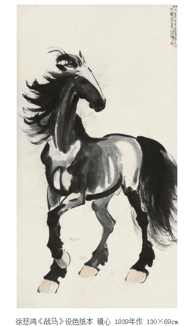 上世纪30年代,徐悲鸿先生所作水墨骏马,桀骜不驯,发掘民族精神,在写实的形体中充满着浪漫主义的遐想和激情。此幅《战马》正是作于1939年,时值第二次世界大战爆发之际,悲鸿先生画此马应为出征的将士鼓舞士气的作品,画中战马以一副不可一世的雄赳赳气昂昂之势,像是即将奔赴战场。悲鸿先生喜欢画马,但不像古人那样热衷于画鞍马,他喜欢画野马,喜欢野马的自由和那豪放不羁的气质,更便于抒发自己的情怀。这些马几乎都没有马鞍和缰绳,不仅外形显神骏和壮美,更是非常到位地把握住了一种自然的野性。徐悲鸿先生总结说:“美术之大道,在追索自然。”画中绘一匹战马,回首平视远方,垂尾、左前蹄微微抬起,作前进状,像是即将奔赴战场。悲鸿先生以凝练、简劲的用笔,准确生动的造型,塑造了骏马的神情和“日行千里”的气势。