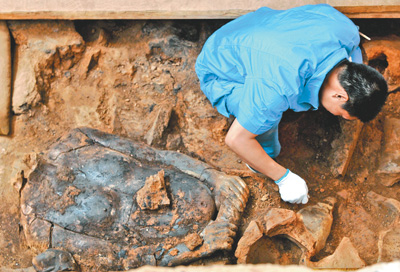 6月9日,考古人员在秦兵马俑一号坑内进行修复工作。