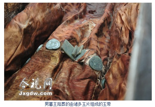 在接下来的发掘过程中,专家打开了墓地中的另一个馆盖。在发现了一些常见的随葬品之后,考古小组有了一个令人振奋的发现,只见躺在棺木中的墓主下葬时身着一件官服,上面绣着龙形图案,腰间系着一根由诸多玉片组成的玉带。除去官服后,里面还穿着一件龙纹长袍。并且在棺木中发现了“万历通宝”字样的铜钱,可以认定此墓为万历年间的(注:1573年- 1620年),距今400余年。由于其腰间系着和田青玉20余块,加之其身着龙纹官服,可以初步断定其为明朝皇室后裔。