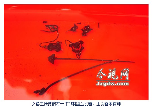 记者在现场看到,有许多前来看热闹的市民把考古现场围得水泄不通。考古小组最先打开了密封较差的一个墓。棺盖打开后,棺内盛满了积水。除去积水后,专家发现了少许随葬品,有12片玉饰,及若干件银制鎏金发簪、玉发簪等首饰,还有几粒木质念珠。由于出土了玉发簪等首饰,由此判定这是一个女墓。