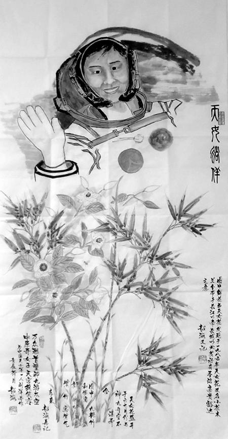 在神舟九号即将返程之际,中原大地上的一位书画家怀着激动的心情为我国第一位女航天员刘洋创作了一幅颇具新意的诗竹画。6月28日,最后一枚印章印在了画作右下角,由当代诗竹画创始人王超海创作的《天女徜徉》全部完成。王超海说:“希望刘洋回家的时候,能够把这幅画送给她,以表达我对她的敬意。”
