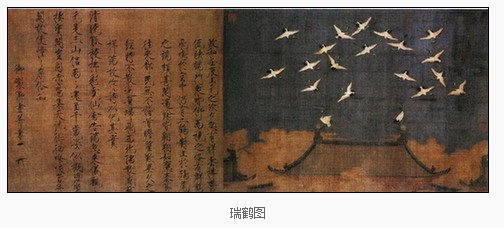 北宋政和二年上元之次夕(即公元1112年正月十六日),都城汴京上空忽然云气飘浮,低映端门, 群鹤飞鸣于宫殿上空,久久盘旋,不肯离去,两只仙鹤竟落在宫殿左右两个高大的鸱吻之上。引皇城宫人仰头惊诧,行路百姓驻足观看。空中仙禽竟似解人意,长鸣如诉,经时不散,后迤逦向西北方向飞去。当时徽宗亲睹此情此景兴奋不已,认为是祥云伴着仙禽前来帝都告瑞——国运兴盛之预兆,于是欣然命笔,将目睹情景绘于绢素之上,并题诗一首以纪其实。