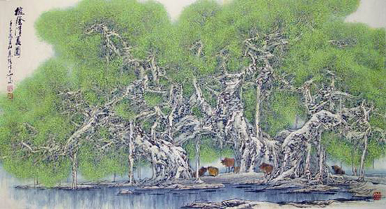 杜应强 榕荫清夏图96.5x179cm