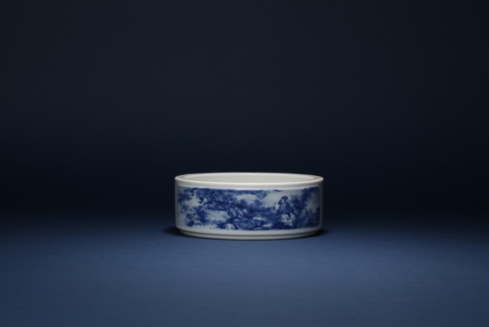 王步 青花双面开光高士图笔洗 1674年 H:8cm D:21.5cm