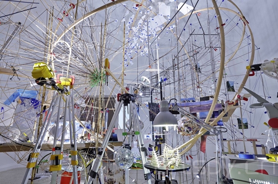 萨拉·施(Sarah Sze)将原先位于展馆正面的入口改到了建筑的侧面;观众没能从一个宏伟的入口以合理的方式进入到一个合理的空间中,艺术家使他们感觉自己就像是偷溜进去的一样。显然这时情况已经失衡了。在第一间展厅的地板上,萨拉·施(Sarah Sze)用黑色的胶带打造出了一个罗盘,它被固定在之前曾是接待室的空间的地板上,有效地转移了展馆的重心。萨拉·施(Sarah Sze)在这个人造的罗盘上又安装了一件庞大的装置作品,它会让人联想到天文馆里天空的模型。这一古怪的“天文台”由风景快照、用来测试色盲的卡片、蓝色的塑料瓶盖、钳子、裁纸刀、颜料罐等各种各样的物品和材料构成。