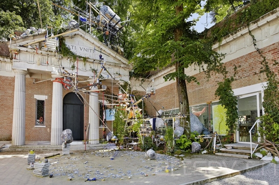 此次美国馆之旅开始于萨拉·施(Sarah Sze)对一堆真实的石头的展示;这些石头长久以来都堆在美国馆的前院中,被半掩埋在碎石里。距离这些石头几步之遥的地方则是萨拉·施(Sarah Sze)人工创造的“石头”:她用印有非常真实的石头图像的包装纸来包裹雕塑材料,然后再为其添加上地衣的图像。这些石头和其它的材料——如带子、苔藓、水瓶、玻璃容器等一起形成了似乎可以移动的、像藤条一样攀爬上了展馆正门的雕塑。