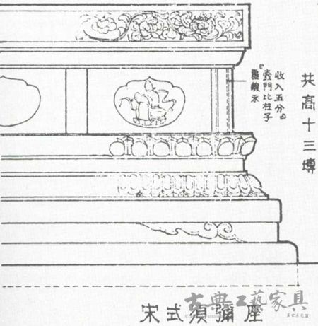 梁思成主编的《建筑设计参考图集简说》被《中国营造学社汇刊》第六卷第二期收录,此文第一集台基中,讲解须弥座的建筑形式中写道“……有枭混莲瓣的须弥座,殆至五代乃渐盛行,至宋而更盛。基身或以小立柱分格,内镶壶门等等,基上下枭混始见复杂。”文中配列的图片也清晰的说明了壶门结构的样式。(图4)