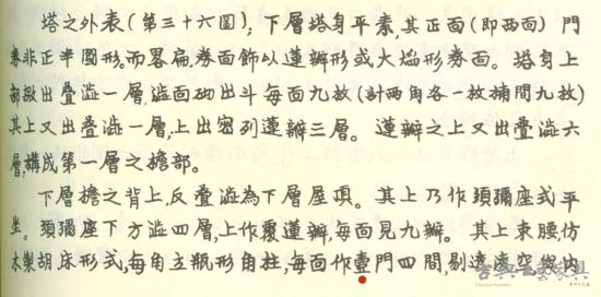 同样,在中国营造学社汇刊第五卷第四期,一百三十九页,由梁思成、林徽因所著的《平郊建筑杂录》第四章节,由天宁寺谈到建筑年代之鉴别问题,记叙天宁寺塔时写道:“塔建于一方形大平台之上,平台之上始立八角形塔座。座甚高,最下一部为须弥座,其束腰有壶门花饰,转角有浮雕像。此上又有镂刻着壶门浮雕之束腰一道。”文中所配图片的壶门花饰也与明清家具中的壶门轮廓别无二致。在此卷的一百四十九页,作者还详细分析了各代壶门形式的不同:“平坐斗拱之下更有间柱及壶门,间柱的位置与斗拱不相对,其上力神像当在下文讨论。壶门的形式及其起线软弱柔圆,不必说没有丝毫六朝刚强的劲儿,就是与我们所习见的宋代扁桃式壶门也还比不上其稳健,我们的推论也以为是明清重修的结果。”