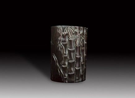 仅仅是材质稀有珍贵也许并不能称之为“奇”,但是珍贵稀有的材质再加上“点竹成金”的嘉定派雕刻技法,称为“奇”却是一点也不为过了。这是一件清嘉定派的紫竹雕作品。嘉定派是历史上流传时间最长、规模最大的雕刻艺术流派,其主要特征是“高、深、透”, 用刀如运笔。艺术风格注重表现丰富而立体的画面层次,重视写实,突出传神,强调形神兼具。嘉定派始于明中期,至清代康熙乾隆年间达到全盛,出现了一批卓有成就的大家和数代经营的世家。清嘉定派竹雕的各种技法,如圆雕、浮雕、镂雕、留青、阴刻、文竹等,经过长时间的传承都已经非常成熟,有一整套工艺程序、技法口诀和制作工具,可以使多种雕刻技法巧妙而完美的结合在一起。嘉定派可以用最不珍贵的竹材,制作出价值丝毫不逊于用玉石、犀角、象牙等贵重材料的雕刻,并成为中国雅玩雕刻艺术的代表,这是它最大的艺术魅力所在。这件清嘉定紫竹笔筒的题材刻画的是古代文人墨客非常喜欢刻画的竹子,但是通篇都只有竹子。从艺术创作上来讲,越是简单的东西越体现功力。此紫竹笔筒整体构图大方素雅,毫无矫揉造作之感,寥寥几刀,一副竹林图就跃然于紫竹笔筒之上,融绘画与雕刻两种艺术形式的美感于一炉,是观赏和使用的最佳奇品。