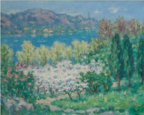中国美术学院油画系资深教授马玉如先生,曾任中国美术学院附中校长,他虽出生于绍兴,却长期生活、工作在西湖之畔,生活中养成每日散步和爬山的习惯,对西湖情有独钟。他的《孤山梅香》注入他对西湖的浓浓情意,画的是一个春光明媚的日子,温煦的暖风吹得游人陶醉——远处,湖光不动声色,保俶塔亭亭玉立;近处,梅花正自喧闹。满坡的梅花泛着粉白之色,在浓柳绿荫的衬托下,格外地鲜艳,正可用“香雪海”三字形容。《水经注》有记载:“山不连陵曰孤,梅花屿介于两湖之间,四面岩峦……是地水望澄明,皦焉冲照,亭观绣峙……山麓多梅,为林和靖放鹤之地……”《孤山梅香》正是画出了丽日当空、春和景明的孤山,我们仿佛闻到了梅花淡淡的清芳。