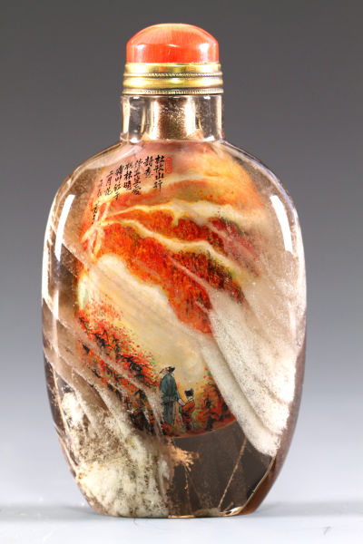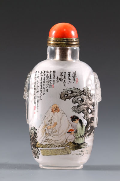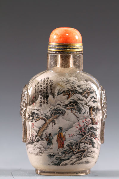三件作品材质为自天然发晶,均取唐诗为素材,大师加以艺术加工所画,构图简介明快,意境洒脱不俗,取各只烟壶特色,水晶发丝或代表奇石、或代表云端、或代表狂风、或代表花草。大师着重意境的表现与诗意的结合,取其内涵给人以美的享受。