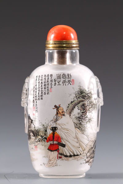 此五件作品,材质均为天然水晶,为小品写意人物套壶,人物为春秋百家和文人雅士,构图讲究,有着雅俗共赏,诗书画一体的文人气质,看画就会让人想到孔子仁、老子道、陶潜隐、板桥竹。图文并茂,才子本色。
