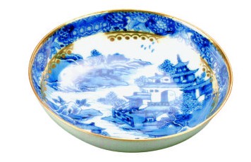 8.青花描金山水楼阁盘(图8)盘敞口,弧形浅腹,坦底,圈足。内口沿饰一周青花龟背锦纹,其间有六簇花朵花叶边饰,口沿边与带饰下的波曲圆点为描金装饰。内底绘青花山水,远处群山相连,河水由远而近盘旋而来,近处岸边有楼阁,房屋,古树,栏杆,天边雁子远飞,大好山河,尽入盘中。