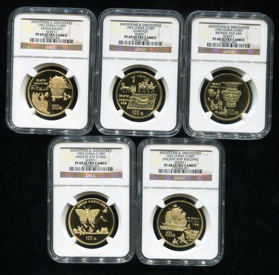 1992年中国古代科技发明发现第(1)组1盎司金币五枚一套(发行量:1000套、带盒、带一枚海外证书、NGC PF68、PF69)