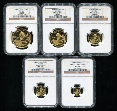 1998年熊猫普制金币五枚一套(含1/20盎司、1/10盎司、1/4盎司、1/2盎司、1盎司、部分小字版、NGC MS69)