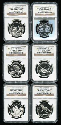 1988年-1999年十二生肖1盎司精制银币各一枚(带十张证书、NGC PF69)